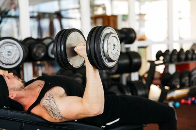 Bankdrücken schwer: 3×5 (Kraft) Schrägbankdrücken mit KH: 3×10 (Volumen)